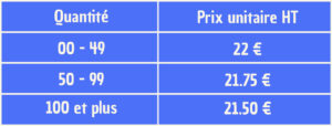 Prix dégressif selon la quantité commandée.